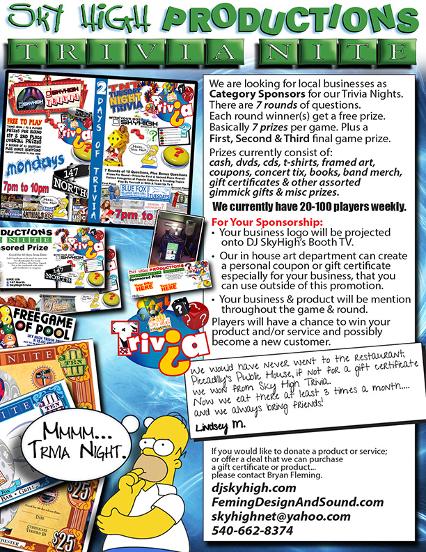 Sky High Trivia is a 7 to 10 round FREE trivia game lasting around 2 hrs.